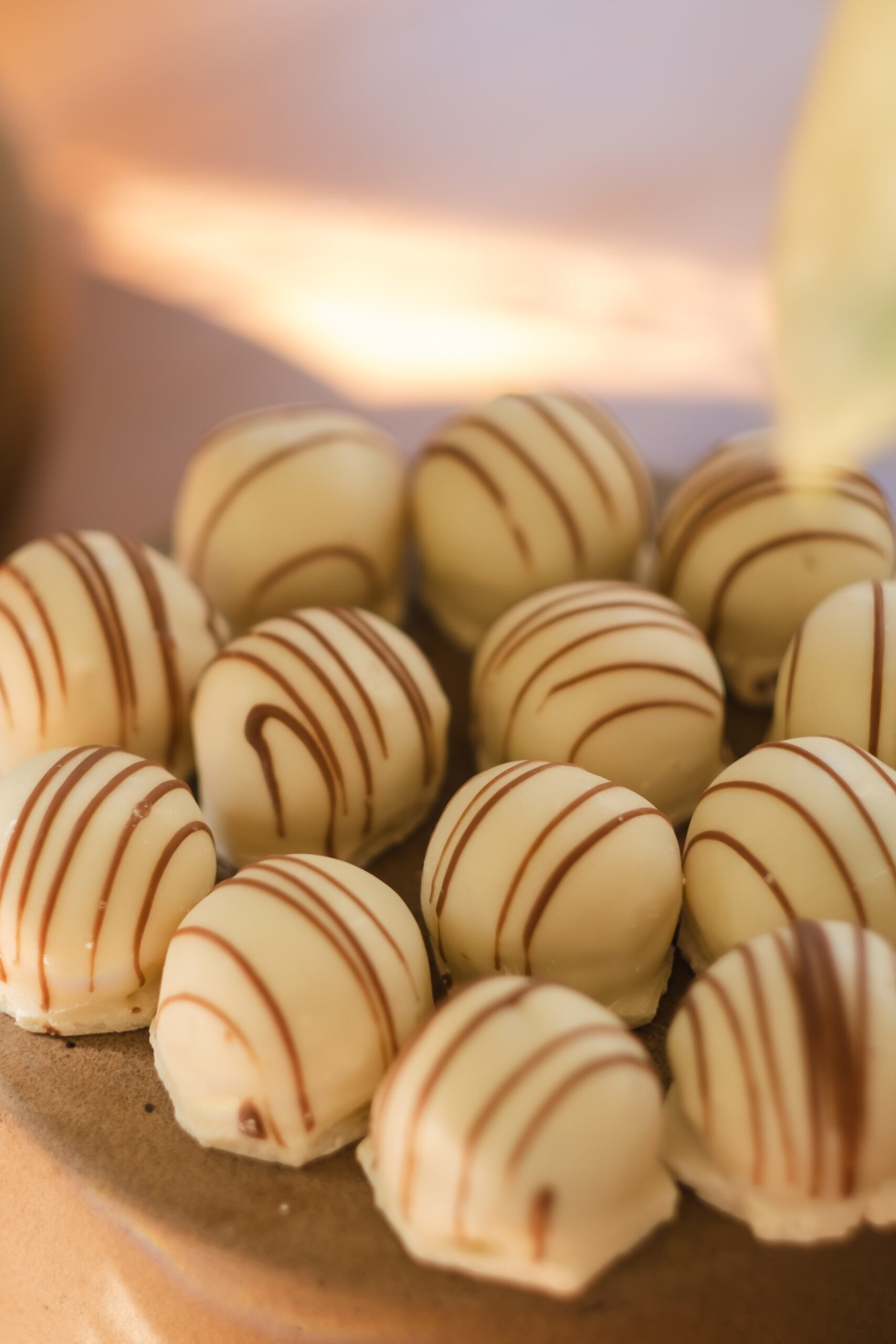 BRIGADEIRO BRANCO, UVA E COBERTO COM CHOCOLATE BRANCO.