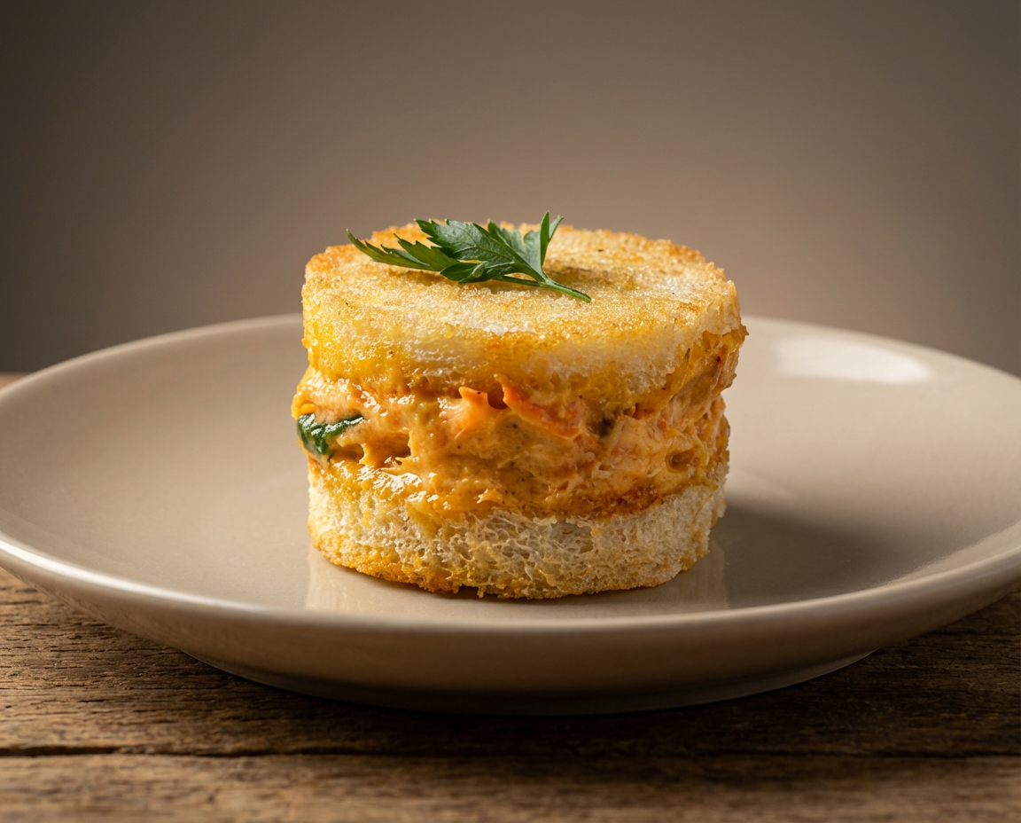 Sanduiche elaborado com mini pão sem casca tostado e recheado um leve e saboroso patê de frango (Maionese, frango, cenoura ralada e batata palha)