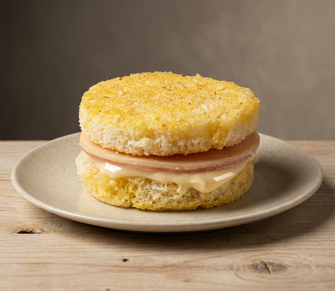 Sanduiche elaborado com mini pão sem casca tostado e recheado com presunto, mussarela e requeijão cremoso.