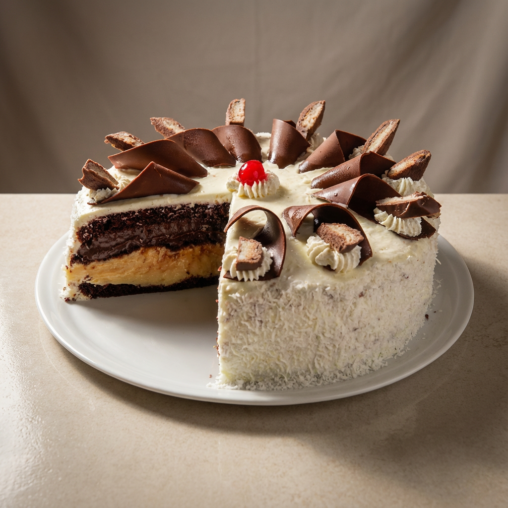 PÃO DE LÓ DE CHOCOLATE, RECHEADO COM UMA CAMADA DE BRIGADEIRO, OUTRA DE CREME DE CÔCO, DECORADO COM CHANTILLY FRESCO, RASPAS DE CHOCOLATE AO LEITE E PEDACINHOS DE PRESTÍGIO.
